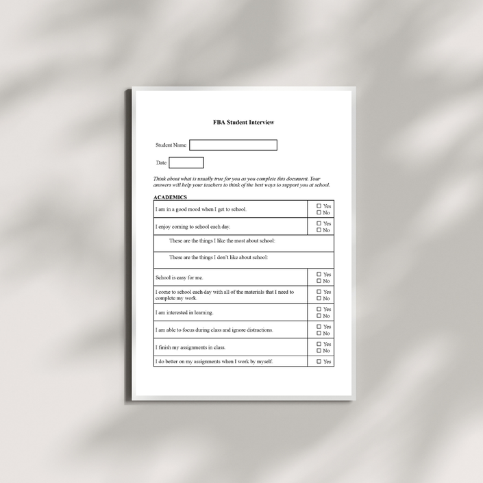 The FBA STUDENT INTERVIEW assesses students' thoughts, feelings, and beliefs regarding academics, teachers & school staff, classmates, and home life. It also includes a reinforcer survey that allows students to choose what they would be interested in earning as rewards for appropriate behavior. In total, there are 37 yes/no items, 5 open-ended items, and 28 reinforcers to choose from. Best of all, this bundle includes the interview in two different formats - Google Docs and Google Forms!